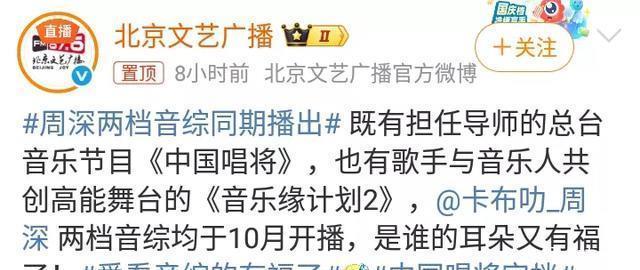 90后歌手周深的两档音综同期播出,是国庆中秋佳节后的一大喜讯!北京文艺广播媒体在社交平台发文,公开报道了这样一个好消息!
